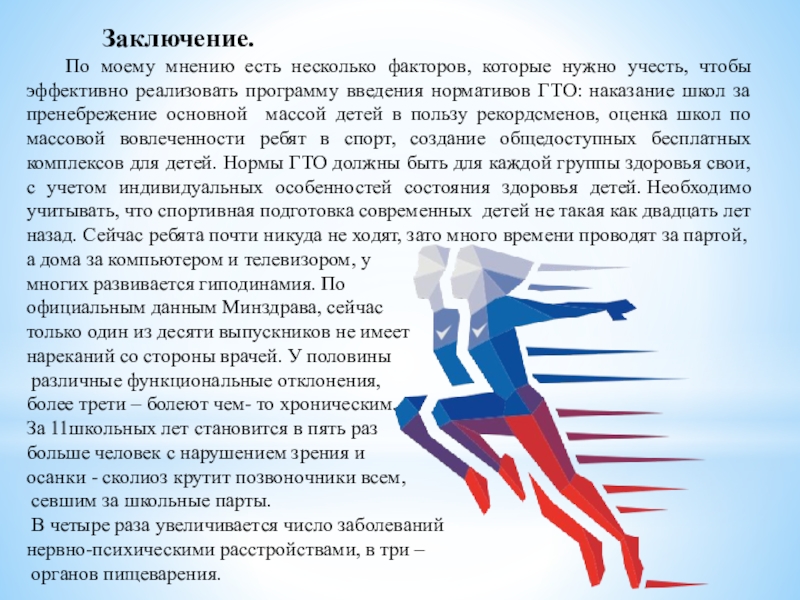 В заключении хочется сказать, что нам предстоит многолетняя, трудоемкая работа по внедрению комплекса ГТО (это и дополнительное материально-техническое обеспечение и подготовка кадров).