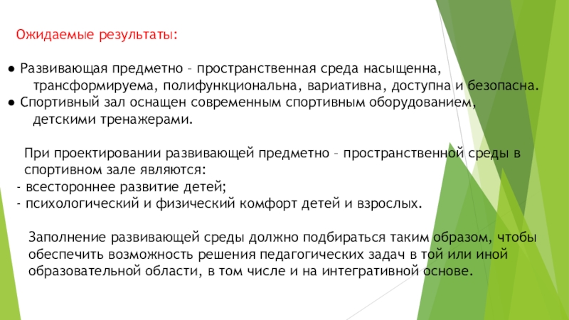 - является содержательной, насыщеной, трансформируемой, полифункциональной, вариативной, доступной и безопасной.