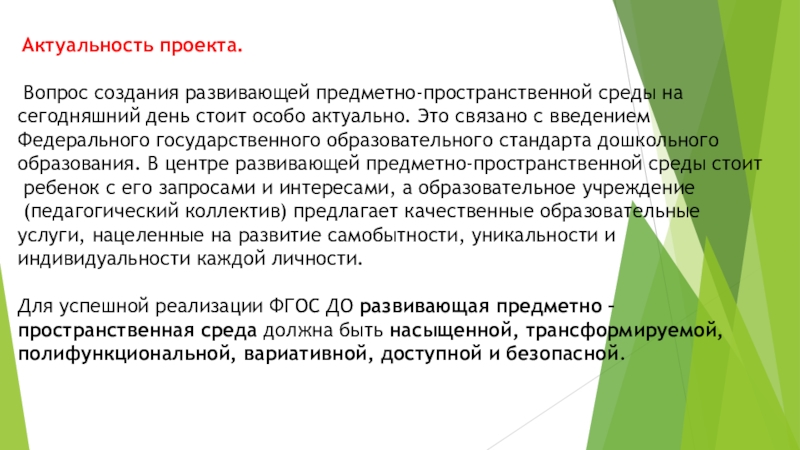 Для успешной реализации ФГОС ДО развивающая предметно – пространственная среда должна быть насыщенной, трансформируемой, полифункциональной, вариативной, доступной и безопасной.