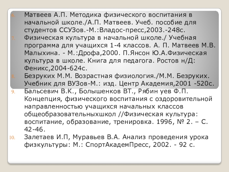 Слайд 29Матвеев А.П. Методика физического воспитания в начальной школе./А.П. Матвеев. Учеб. пособие