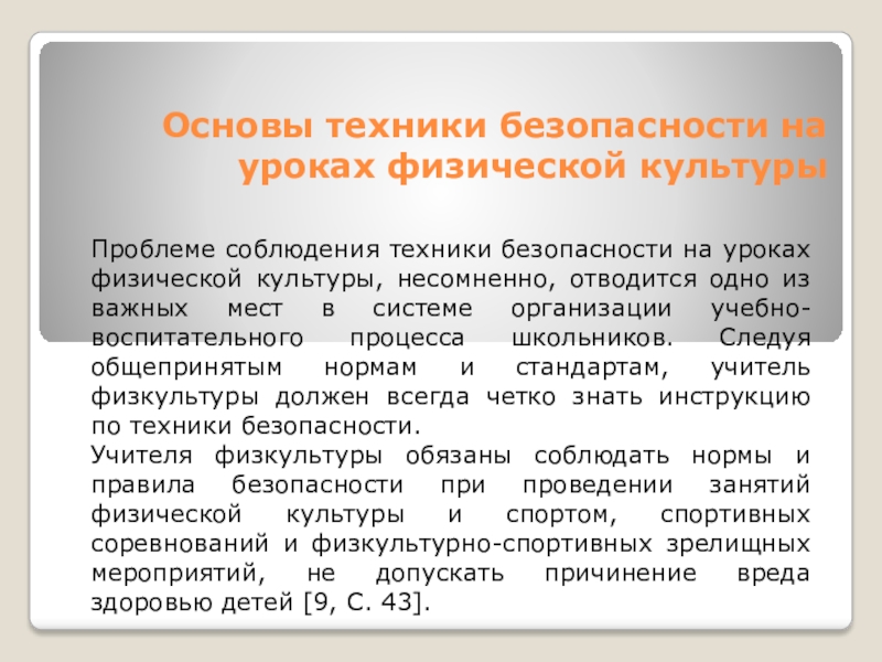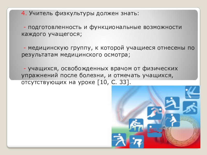 Учителя физкультуры обязаны соблюдать нормы и правила безопасности при проведении занятий физической культуры и спортом, спортивных соревнований и физкультурно-спортивных зрелищных мероприятий, не допускать причинение вреда здоровью детей [9, С. 43].