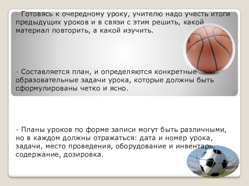 - Планы уроков по форме записи могут быть различными, но в каждом должны отражаться: дата и номер урока, задачи, место проведения, оборудование и инвентарь, содержание, дозировка.