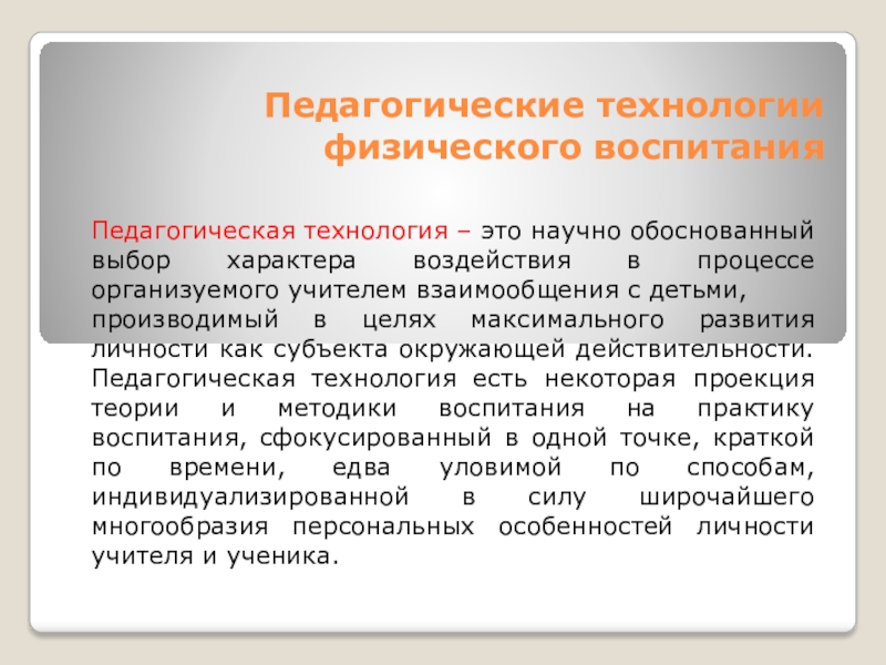 производимый в целях максимального развития личности как субъекта окружающей действительности. Педагогическая технология есть некоторая проекция теории и методики воспитания на практику воспитания, сфокусированный в одной точке, краткой по времени, едва уловимой по способам, индивидуализированной в силу широчайшего многообразия персональных особенностей личности учителя и ученика.