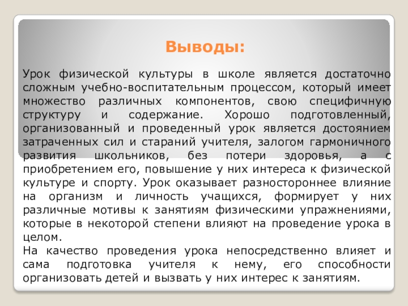 имеет множество различных компонентов, свою специфичную структуру и содержание. Хорошо подготовленный, организованный и проведенный урок является достоянием затраченных сил и стараний учителя, залогом гармоничного развития школьников, без потери здоровья, а с приобретением его, повышение у них интереса к физической культуре и спорту. Урок оказывает разностороннее влияние на организм и личность учащихся, формирует у них различные мотивы к занятиям физическими упражнениями, которые в некоторой степени влияют на проведение урока в целом.