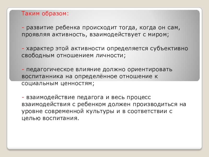 - развитие ребенка происходит тогда, когда он сам, проявляя активность,