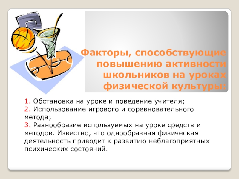 Слайд 10Факторы, способствующие повышению активности школьников на уроках физической культуры: