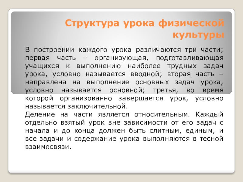 Деление на части является относительным. Каждый отдельно взятый урок вне зависимости от его задач с начала и до конца должен быть слитным, единым, и все задачи и содержание урока выполняются в тесной взаимосвязи.