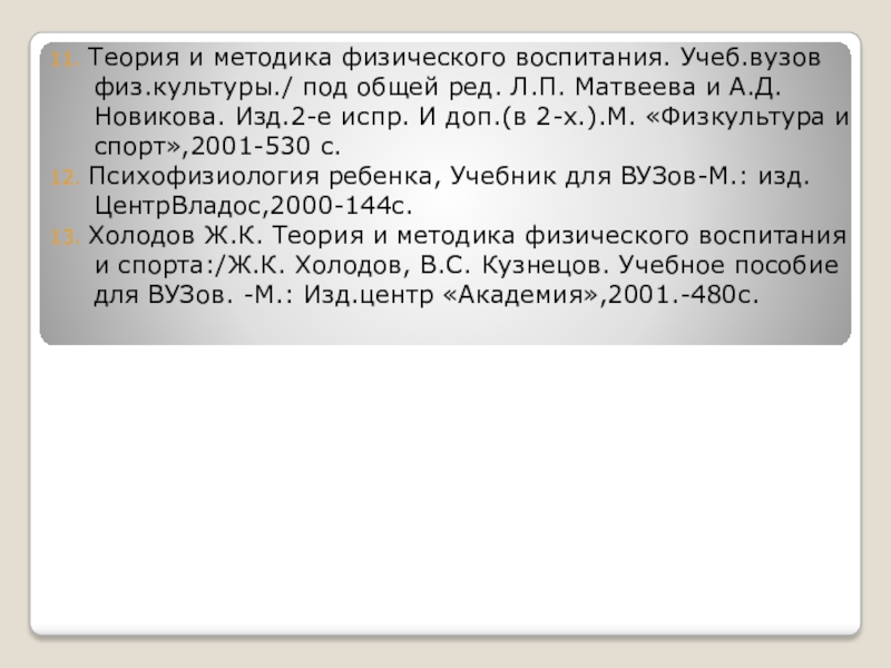 Слайд 3011. Теория и методика физического воспитания. Учеб.вузов физ.культуры./ под общей ред.