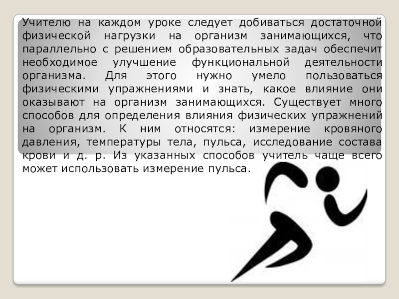 занимающихся, что параллельно с решением образовательных задач обеспечит необходимое улучшение функциональной деятельности организма. Для этого нужно умело пользоваться физическими упражнениями и знать, какое влияние они оказывают на организм занимающихся. Существует много способов для определения влияния физических упражнений на организм. К ним относятся: измерение кровяного давления, температуры тела, пульса, исследование состава крови и д. р. Из указанных способов учитель чаще всего может использовать измерение пульса.