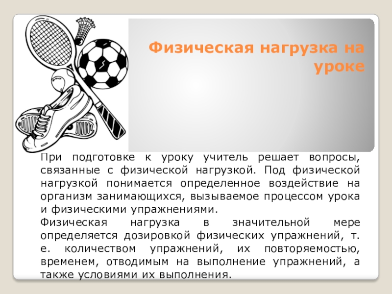 с физической нагрузкой. Под физической нагрузкой понимается определенное воздействие на организм занимающихся, вызываемое процессом урока и физическими упражнениями.