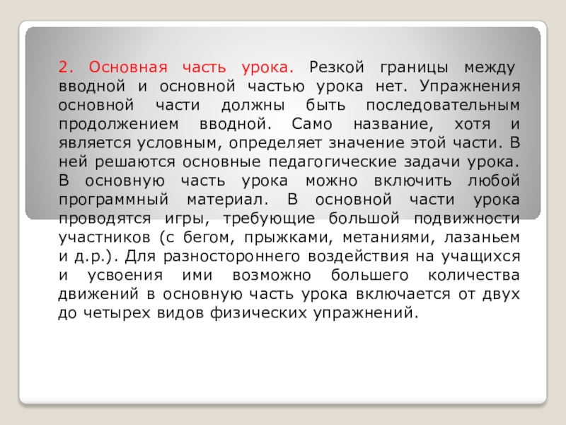 урока нет. Упражнения основной части должны быть последовательным продолжением вводной. Само название, хотя и является условным, определяет значение этой части. В ней решаются основные педагогические задачи урока. В основную часть урока можно включить любой программный материал. В основной части урока проводятся игры, требующие большой подвижности участников (с бегом, прыжками, метаниями, лазаньем и д.р.). Для разностороннего воздействия на учащихся и усвоения ими возможно большего количества движений в основную часть урока включается от двух до четырех видов физических упражнений.