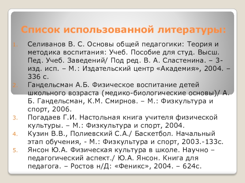 Гандельсман А.Б. Физическое воспитание детей школьного возраста (медико-биологические основы)/ А.Б. Гандельсман, К.М. Смирнов. – М.: Физкультура и спорт, 2006.