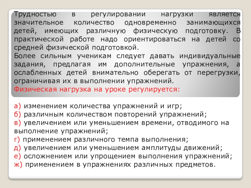Слайд 15Трудностью в регулировании нагрузки является значительное количество одновременно занимающихся детей, имеющих