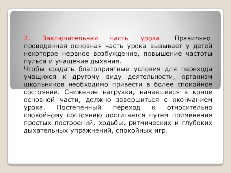 Чтобы создать благоприятные условия для перехода учащихся к другому виду деятельности, организм школьников необходимо привести в более спокойное состояние. Снижение нагрузки, начавшееся в конце основной части, должно завершиться с окончанием урока. Постепенный переход к относительно спокойному состоянию достигается путем применения простых построений, ходьбы, ритмических и глубоких дыхательных упражнений, спокойных игр.