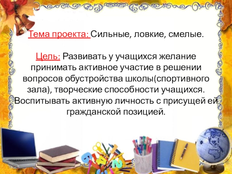 Тема проекта: Сильные, ловкие, смелые. Цель: Развивать у учащихся желание принимать активное участие в решении вопросов обустройства школы(спортивного зала), творческие способности учащихся. Воспитывать активную личность с присущей ей гражданской позицией.