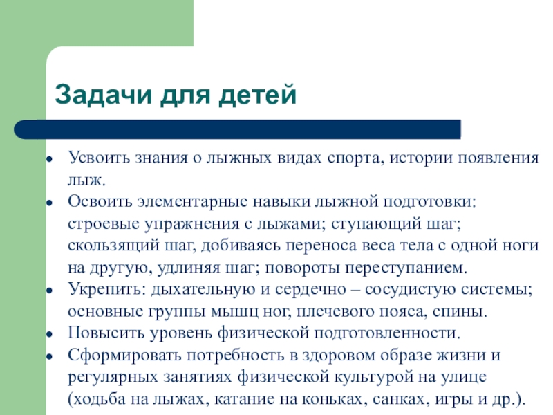 создание мотивации у субъектов образовательного процесса (детей, родителей) к занятиям лыжной подготовкой и представления о зимних видах спорта, истории появления лыж.