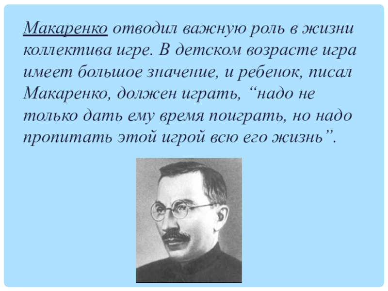 Слайд 9Макаренко отводил важную роль в жизни коллектива игре. В детском возрасте