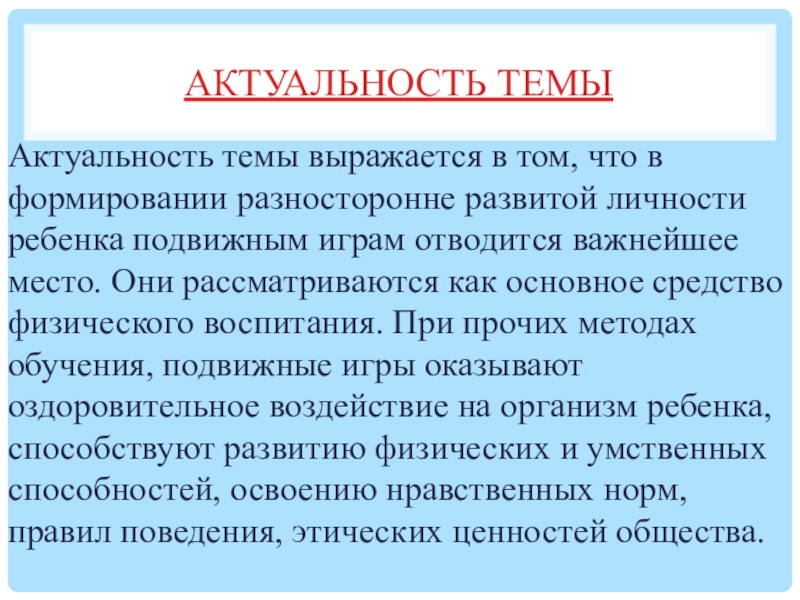Актуальность темы выражается в том, что в формировании разносторонне развитой