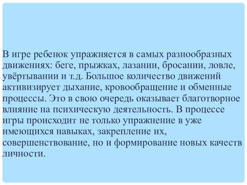бросании, ловле, увёртывании и т.д. Большое количество движений активизирует дыхание, кровообращение и обменные процессы. Это в свою очередь оказывает благотворное влияние на психическую деятельность. В процессе игры происходит не только упражнение в уже имеющихся навыках, закрепление их, совершенствование, но и формирование новых качеств личности.