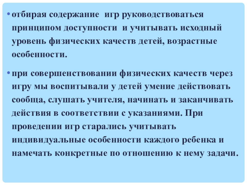 Слайд 50отбирая содержание игр руководствоваться принципом доступности и учитывать исходный уровень физических