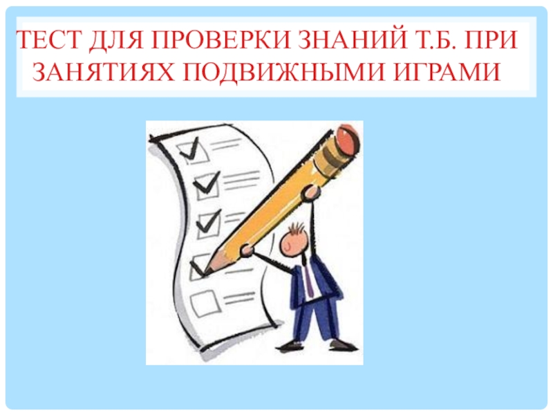 Слайд 13Тест для проверки знаний Т.Б. при занятиях подвижными играми