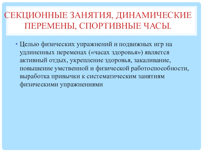 Слайд 43Секционные занятия, динамические перемены, спортивные часы.