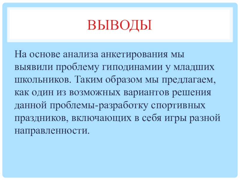 Таким образом мы предлагаем, как один из возможных вариантов решения данной проблемы-разработку спортивных праздников, включающих в себя игры разной направленности.