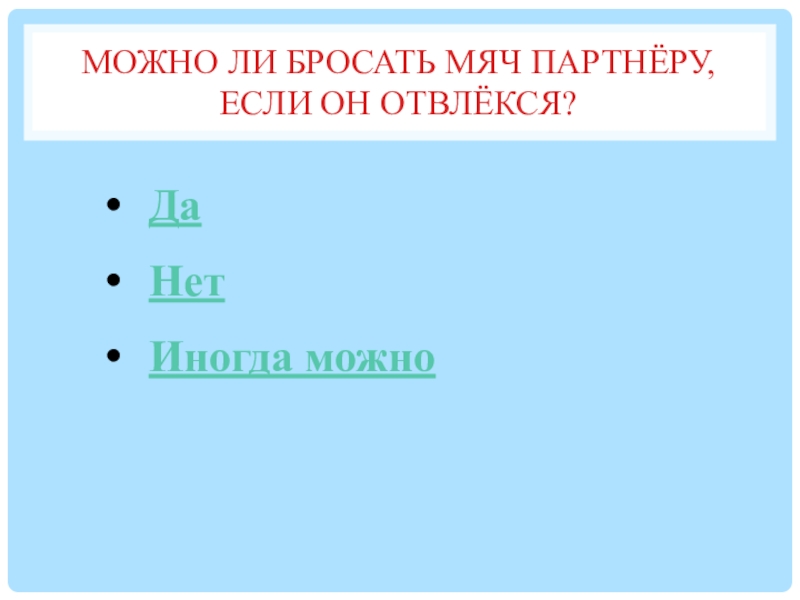 Слайд 18Можно ли бросать мяч партнёру, если он отвлёкся?