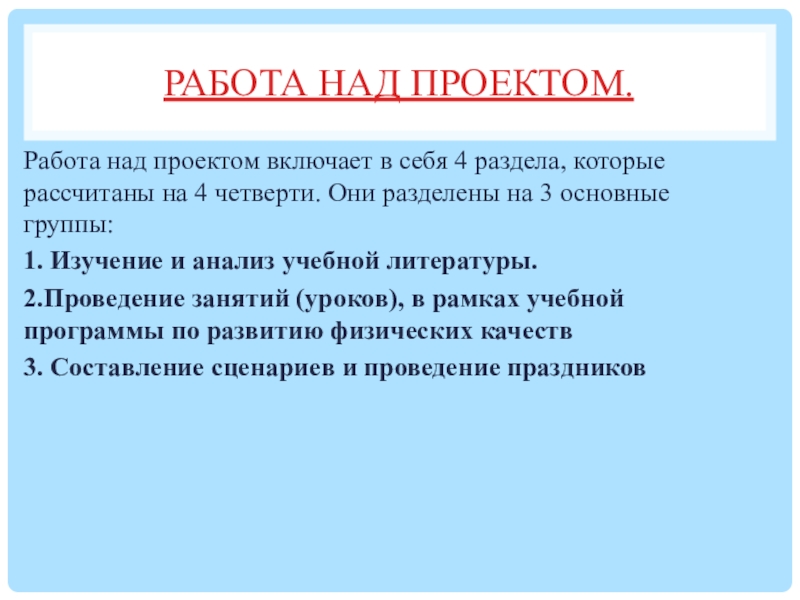 Работа над проектом включает в себя 4 раздела, которые