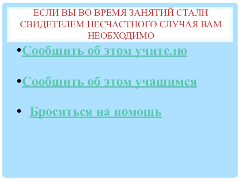 Слайд 14Если вы во время занятий стали свидетелем несчастного случая вам необходимо