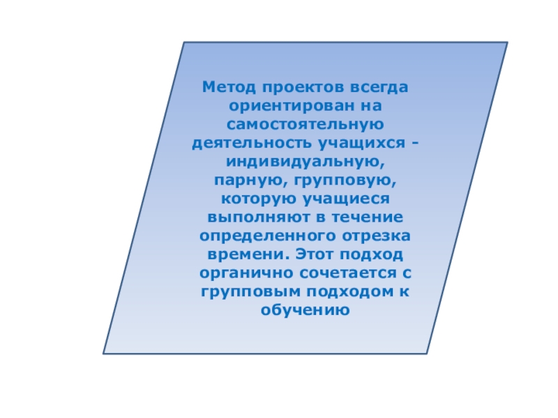 Слайд 6Метод проектов всегда ориентирован на самостоятельную деятельность учащихся - индивидуальную, парную,