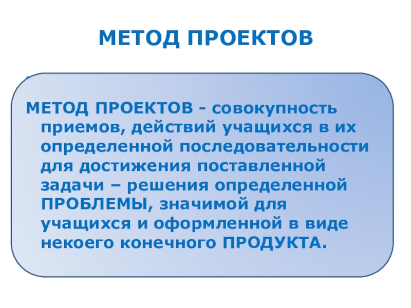 МЕТОД ПРОЕКТОВ - совокупность приемов, действий учащихся в их определенной последовательности для достижения поставленной задачи – решения определенной ПРОБЛЕМЫ, значимой для учащихся и оформленной в виде некоего конечного ПРОДУКТА.