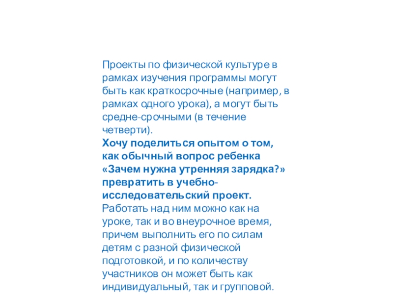 Слайд 9Проекты по физической культуре в рамках изучения программы могут быть как