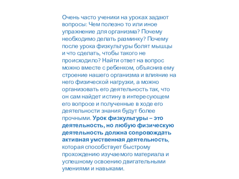 иное упражнение для организма? Почему необходимо делать разминку? Почему после урока физкультуры болят мышцы и что сделать, чтобы такого не происходило? Найти ответ на вопрос можно вместе с ребенком, объяснив ему строение нашего организма и влияние на него физической нагрузки, а можно организовать его деятельность так, что он сам найдет истину в интересующем его вопросе и полученные в ходе его деятельности знания будут более прочными. Урок физкультуры – это деятельность, но любую физическую деятельность должна сопровождать активная умственная деятельность, которая способствует быстрому прохождению изучаемого материала и успешному освоению двигательными умениями и навыками.