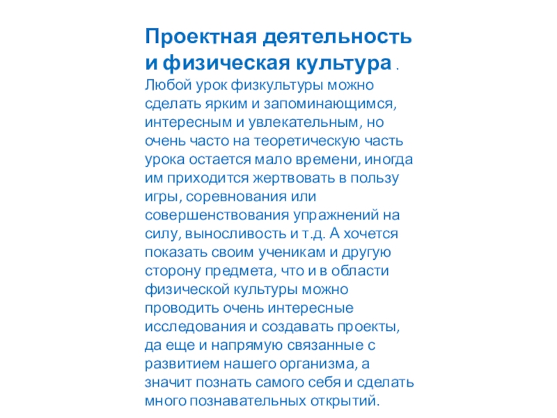 запоминающимся, интересным и увлекательным, но очень часто на теоретическую часть урока остается мало времени, иногда им приходится жертвовать в пользу игры, соревнования или совершенствования упражнений на силу, выносливость и т.д. А хочется показать своим ученикам и другую сторону предмета, что и в области физической культуры можно проводить очень интересные исследования и создавать проекты, да еще и напрямую связанные с развитием нашего организма, а значит познать самого себя и сделать много познавательных открытий.