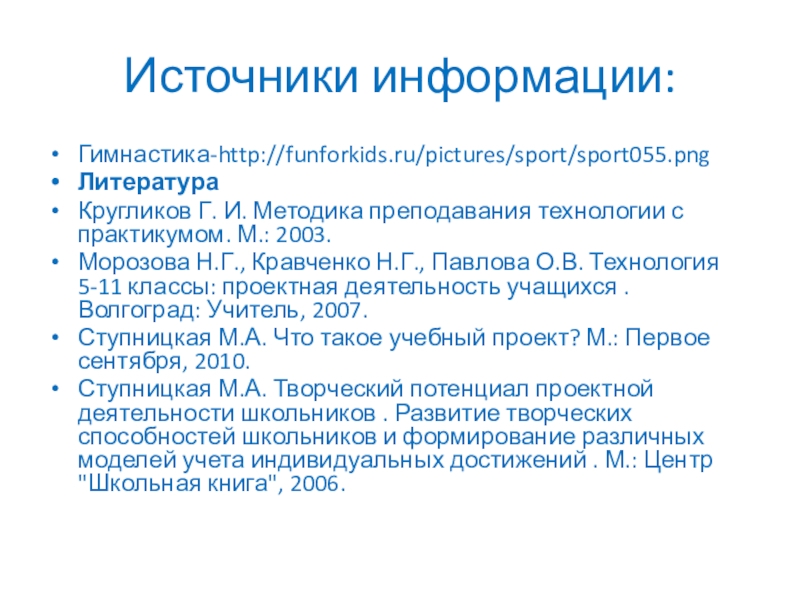 Ступницкая М.А. Творческий потенциал проектной деятельности школьников . Развитие творческих способностей школьников и формирование различных моделей учета индивидуальных достижений . М.: Центр "Школьная книга", 2006.