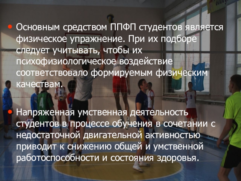 Слайд 23Основным средством ППФП студентов является физическое упражнение. При их подборе следует