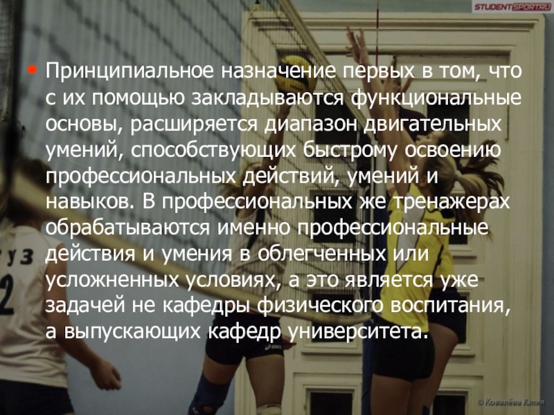 основы, расширяется диапазон двигательных умений, способствующих быстрому освоению профессиональных действий, умений и навыков. В профессиональных же тренажерах обрабатываются именно профессиональные действия и умения в облегченных или усложненных условиях, а это является уже задачей не кафедры физического воспитания, а выпускающих кафедр университета.