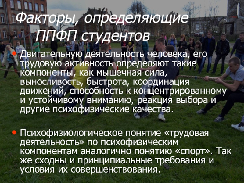 Слайд 15Основные факторы, определяющие конкретное содержание ППФП