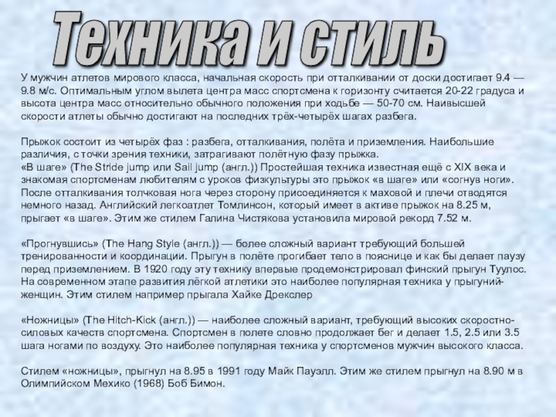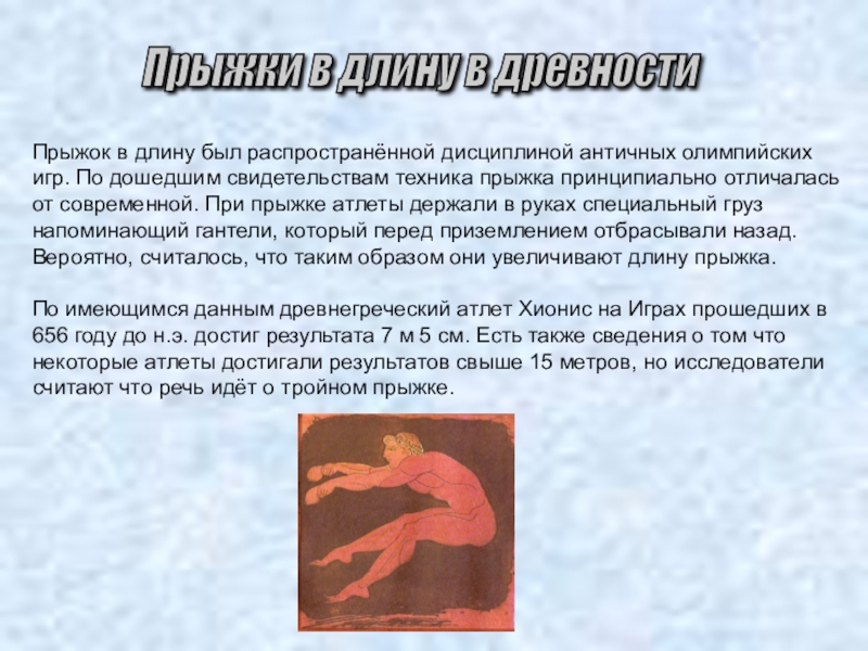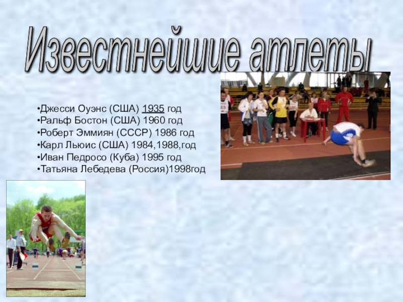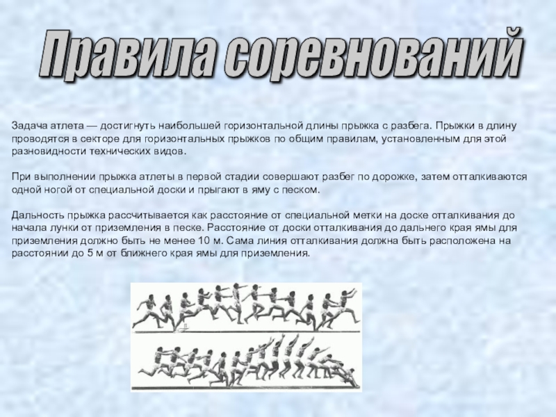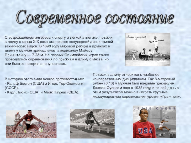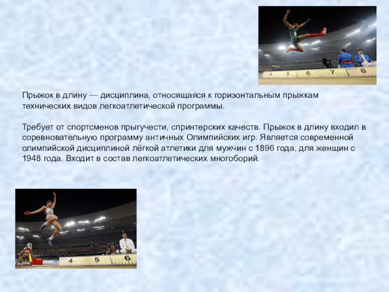 Прыжок в длину относится к наиболее консервативным дисциплинам. Так 8-метровый рубеж (8.13) у мужчин был впервые преодолен Джесси Оуэнсом еще в 1935 году, и по сей день с этим результатом можно выиграть крупные международные соревнования уровня «Гран-при».