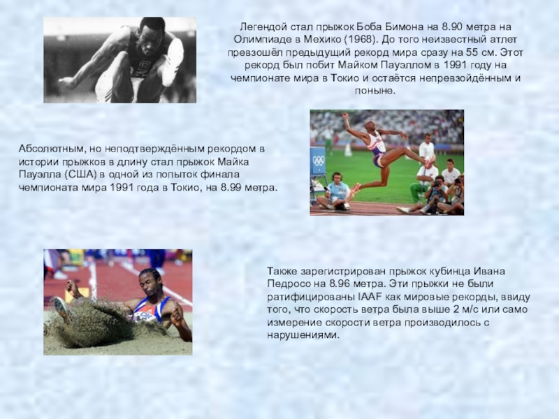 Абсолютным, но неподтверждённым рекордом в истории прыжков в длину стал прыжок Майка Пауэлла (США) в одной из попыток финала чемпионата мира 1991 года в Токио, на 8.99 метра.