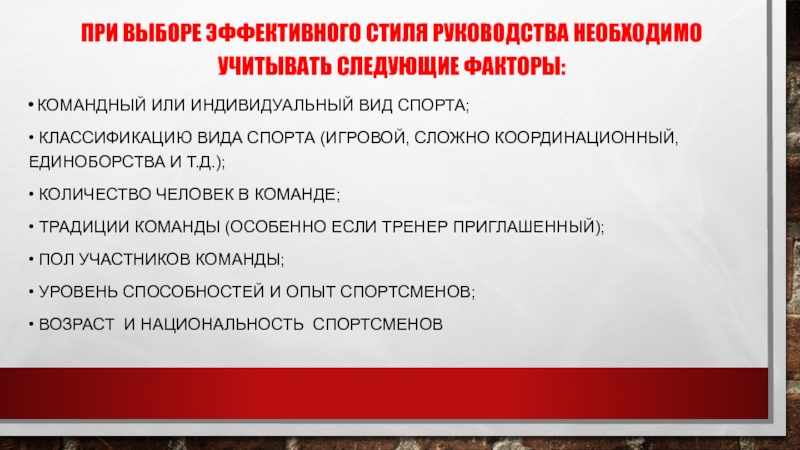 Слайд 16При выборе эффективного стиля руководства необходимо учитывать следующие факторы: