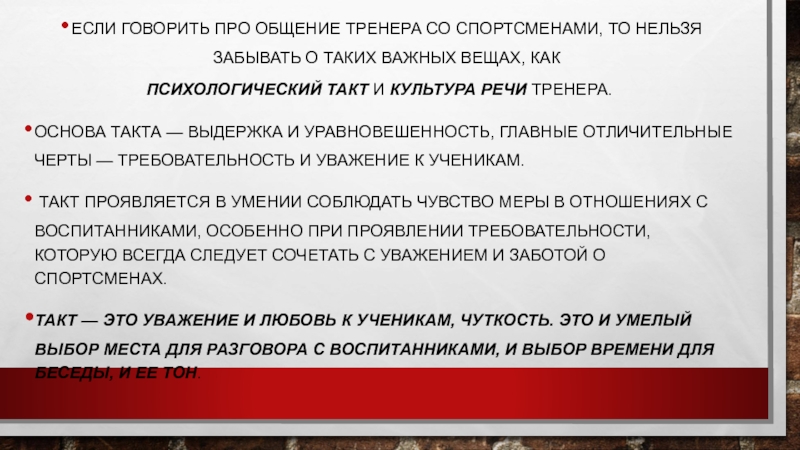 Такт проявляется в умении соблюдать чувство меры в отношениях с воспитанниками, особенно при проявлении требовательности, которую всегда следует сочетать с уважением и заботой о спортсменах.