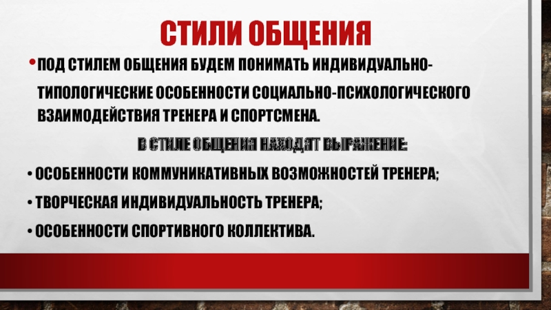 Под стилем общения будем понимать индивидуально-типологические особенности социально-психологического взаимодействия тренера
