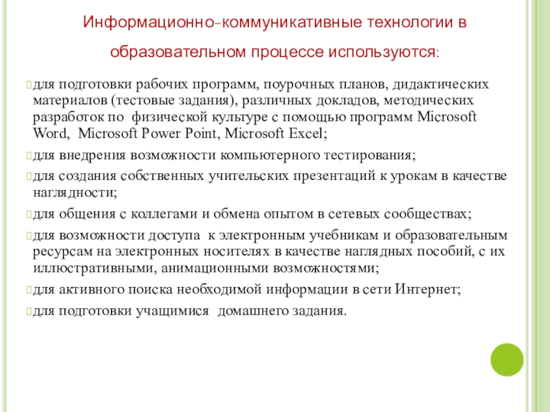 дидактических материалов (тестовые задания), различных докладов, методических разработок по физической культуре с помощью программ Microsoft Word, Microsoft Power Point, Microsoft Excel;