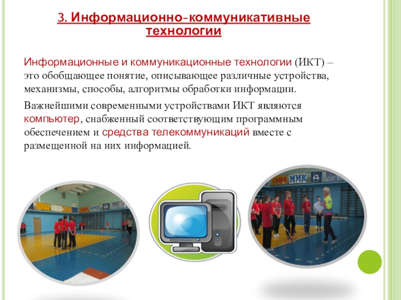 Важнейшими современными устройствами ИКТ являются компьютер, снабженный соответствующим программным обеспечением и средства телекоммуникаций вместе с размещенной на них информацией.