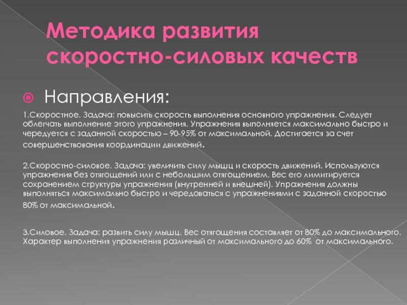 2.Скоростно-силовое. Задача: увеличить силу мышц и скорость движений. Используются упражнения без отягощений или с небольшим отягощением. Вес его лимитируется сохранением структуры упражнения (внутренней и внешней). Упражнения должны выполняться максимально быстро и чередоваться с упражнениями с заданной скоростью 80% от максимальной.