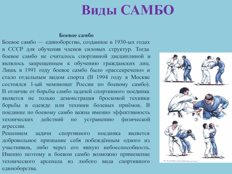 СССР для обучения членов силовых структур. Тогда боевое самбо не считалось спортивной дисциплиной и являлось запрещенным к обучению гражданских лиц. Лишь в 1991 году боевое самбо было «рассекречено» и стало отдельным видом спорта (В 1994 году в Москве состоялся 1-ый чемпионат России по боевому самбо).