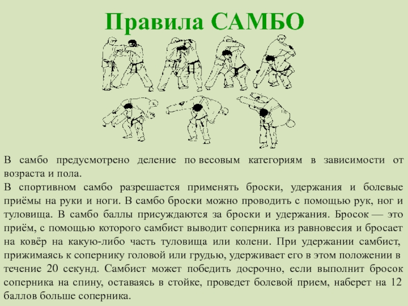 В спортивном самбо разрешается применять броски, удержания и болевые приёмы на руки и ноги. В самбо броски можно проводить с помощью рук, ног и туловища. В самбо баллы присуждаются за броски и удержания. Бросок — это приём, с помощью которого самбист выводит соперника из равновесия и бросает на ковёр на какую-либо часть туловища или колени. При удержании самбист, прижимаясь к сопернику головой или грудью, удерживает его в этом положении в течение 20 секунд. Самбист может победить досрочно, если выполнит бросок соперника на спину, оставаясь в стойке, проведет болевой прием, наберет на 12 баллов больше соперника.
