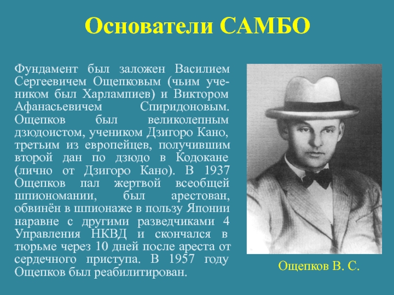 и Виктором Афанасьевичем Спиридоновым. Ощепков был великолепным дзюдоистом, учеником Дзигоро Кано, третьим из европейцев, получившим второй дан по дзюдо в Кодокане (лично от Дзигоро Кано). В 1937 Ощепков пал жертвой всеобщей шпиономании, был арестован, обвинён в шпионаже в пользу Японии наравне с другими разведчиками 4 Управления НКВД и скончался в тюрьме через 10 дней после ареста от сердечного приступа. В 1957 году Ощепков был реабилитирован.